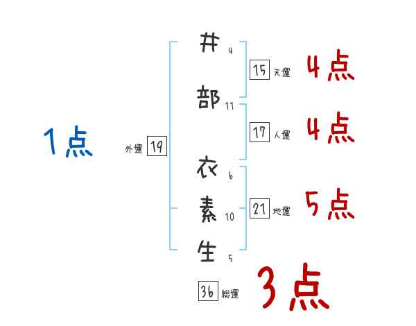 外運![]() | 井部衣素生さんの外運は19画の1つ星!優れた才能を持ちますが、協調性が足りないことも。周りの人と協力する事を意識しましょう。 生活面を象徴する運勢です。外部から受ける影響力を表し、結婚運、家庭運や職場、環境への順応性を表します。 |