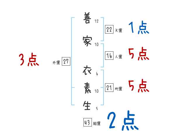 家系が持つ宿命的な運勢を表します。祖先から受け継いだ苗字ですので自分の力が及びません。家柄を象徴します。