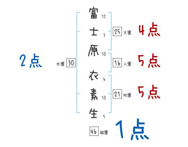 外運![]() | 富士原衣素生さんの外運は30画の2つ星!浮き沈みの激しさに注意しましょう。 生活面を象徴する運勢です。外部から受ける影響力を表し、結婚運、家庭運や職場、環境への順応性を表します。 |