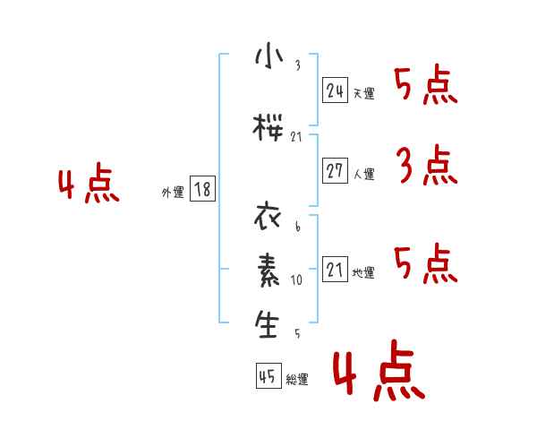 総運![]() | 小桜衣素生さんの総運は45画の4つ星!もくもくと物事を進め達成する。地味な努力家。 あなたの人生を表す1番重要な運勢です。生涯を通じて影響する総合運となり、主に50歳以降の晩年期に影響を及ぼします。 |