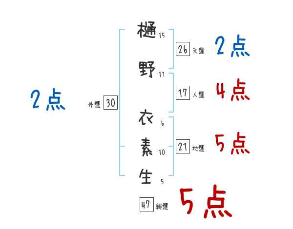 総運![]() | 樋野衣素生さんの総運は47画の5つ星!実力が開花し発展する円満な人生。財に恵まれる。 あなたの人生を表す1番重要な運勢です。生涯を通じて影響する総合運となり、主に50歳以降の晩年期に影響を及ぼします。 |