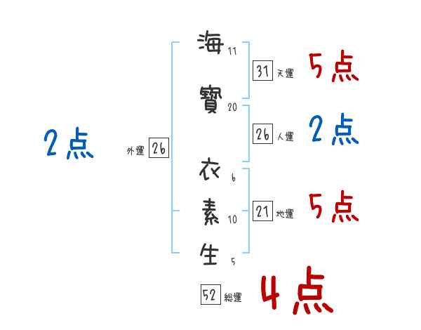 外運![]() | 海寳衣素生さんの外運は26画の2つ星!波瀾万丈かも。信頼できる人を大事にしましょう。 生活面を象徴する運勢です。外部から受ける影響力を表し、結婚運、家庭運や職場、環境への順応性を表します。 |