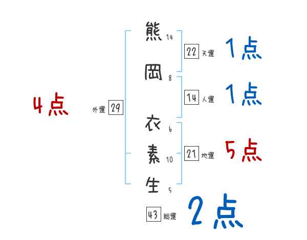 外運![]() | 熊岡衣素生さんの外運は29画の4つ星!完全主義で才能がある。厳格な心の持ち主。 生活面を象徴する運勢です。外部から受ける影響力を表し、結婚運、家庭運や職場、環境への順応性を表します。 |