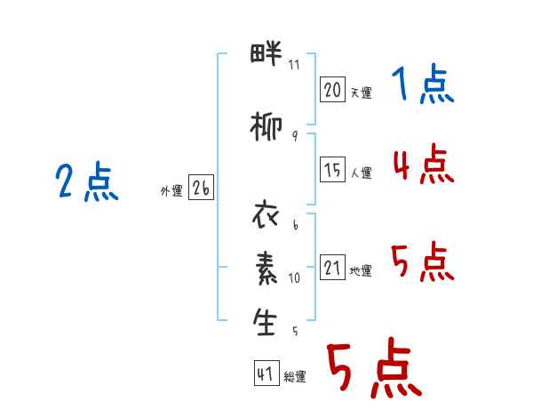 外運![]() | 畔柳衣素生さんの外運は26画の2つ星!波瀾万丈かも。信頼できる人を大事にしましょう。 生活面を象徴する運勢です。外部から受ける影響力を表し、結婚運、家庭運や職場、環境への順応性を表します。 |
