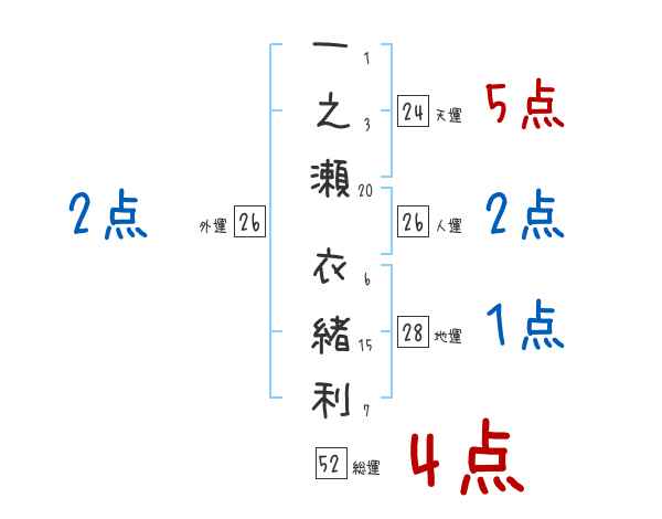 外運![]() | 一之瀬衣緒利さんの外運は26画の2つ星!波瀾万丈かも。信頼できる人を大事にしましょう。 生活面を象徴する運勢です。外部から受ける影響力を表し、結婚運、家庭運や職場、環境への順応性を表します。 |