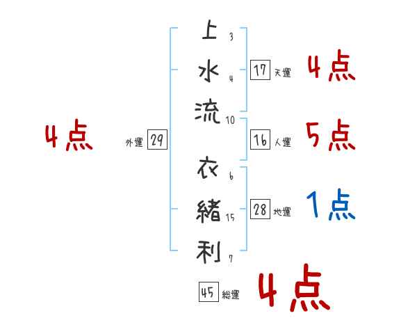 総運![]() | 上水流衣緒利さんの総運は45画の4つ星!もくもくと物事を進め達成する。地味な努力家。 あなたの人生を表す1番重要な運勢です。生涯を通じて影響する総合運となり、主に50歳以降の晩年期に影響を及ぼします。 |