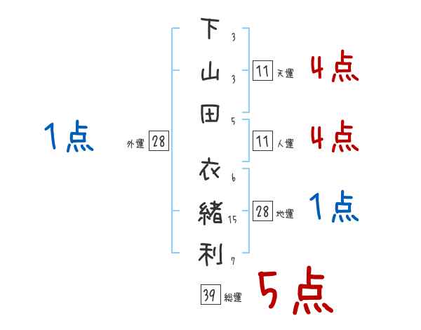 天運![]() | 下山田衣緒利さんの天運は11画の4つ星!着実に富や地位を得る幸運な人生。 家系が持つ宿命的な運勢を表します。祖先から受け継いだ苗字ですので自分の力が及びません。家柄を象徴します。 |