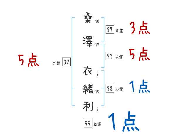 外運![]() | 桑澤衣緒利さんの外運は32画の5つ星!柔軟性があり成功する。チャンスが多く金運が良い。 生活面を象徴する運勢です。外部から受ける影響力を表し、結婚運、家庭運や職場、環境への順応性を表します。 |