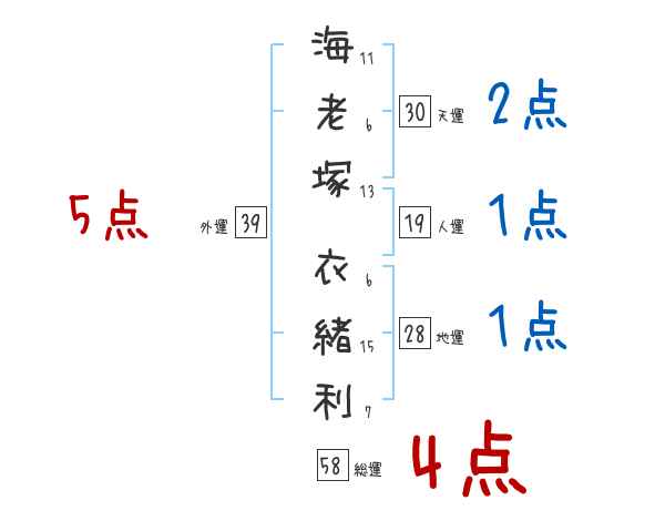 外運![]() | 海老塚衣緒利さんの外運は39画の5つ星!社交性に優れ人望が厚い。人の上に立ち成功する。 生活面を象徴する運勢です。外部から受ける影響力を表し、結婚運、家庭運や職場、環境への順応性を表します。 |