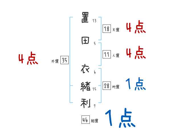 外運![]() | 置田衣緒利さんの外運は35画の4つ星!温厚な性格で感受性が高い。穏和な性格で人望が厚い。 生活面を象徴する運勢です。外部から受ける影響力を表し、結婚運、家庭運や職場、環境への順応性を表します。 |