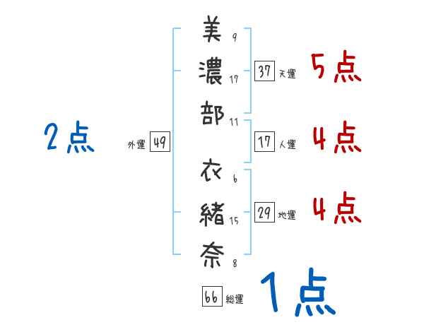 総運![]() | 美濃部衣緒奈さんの総運は66画の1つ星!迷うことが多く挫折しやすい傾向が。辛抱強く物事に取り組みましょう。 あなたの人生を表す1番重要な運勢です。生涯を通じて影響する総合運となり、主に50歳以降の晩年期に影響を及ぼします。 |