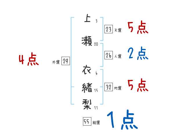 外運![]() | 上瀬衣緒梨さんの外運は29画の4つ星!完全主義で才能がある。厳格な心の持ち主。 生活面を象徴する運勢です。外部から受ける影響力を表し、結婚運、家庭運や職場、環境への順応性を表します。 |