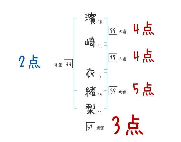 天運![]() | 濱﨑衣緒梨さんの天運は29画の4つ星!完全主義で才能がある。厳格な心の持ち主。 家系が持つ宿命的な運勢を表します。祖先から受け継いだ苗字ですので自分の力が及びません。家柄を象徴します。 |