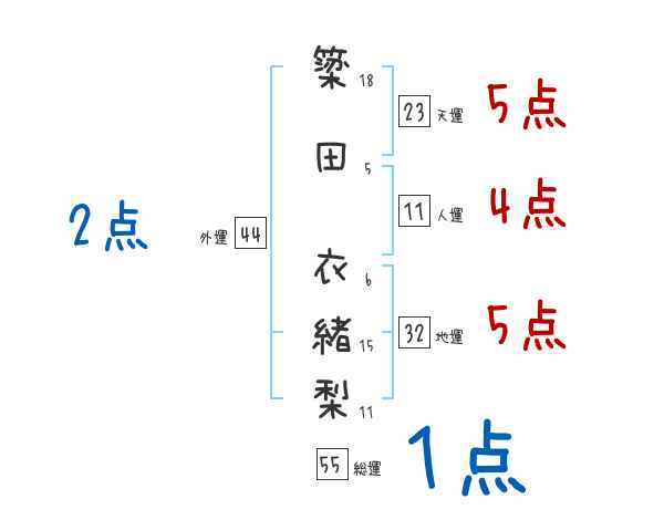 天運![]() | 簗田衣緒梨さんの天運は23画の5つ星!想像力に優れ活力がある。一代で成功し名誉を手に入れる。 家系が持つ宿命的な運勢を表します。祖先から受け継いだ苗字ですので自分の力が及びません。家柄を象徴します。 |