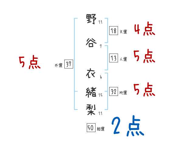 天運![]() | 野谷衣緒梨さんの天運は18画の4つ星!情熱的で剛気。忍耐力があり信頼される。 家系が持つ宿命的な運勢を表します。祖先から受け継いだ苗字ですので自分の力が及びません。家柄を象徴します。 |