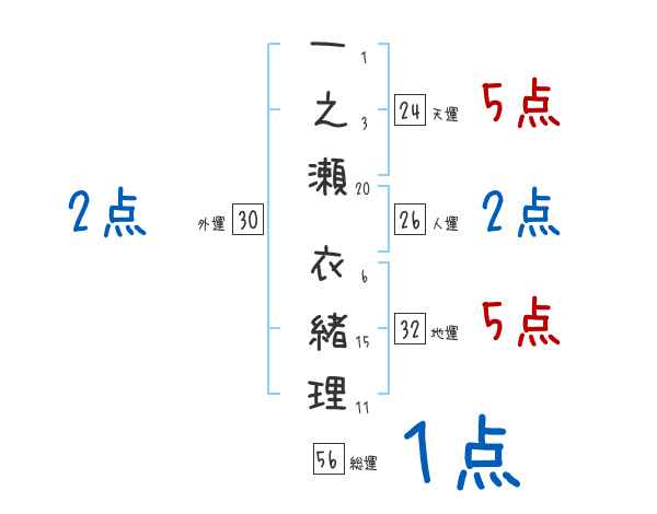 総運![]() | 一之瀬衣緒理さんの総運は56画の1つ星!消極的で無気力になりがち。誠実な気持ちが必要でしょう。 あなたの人生を表す1番重要な運勢です。生涯を通じて影響する総合運となり、主に50歳以降の晩年期に影響を及ぼします。 |