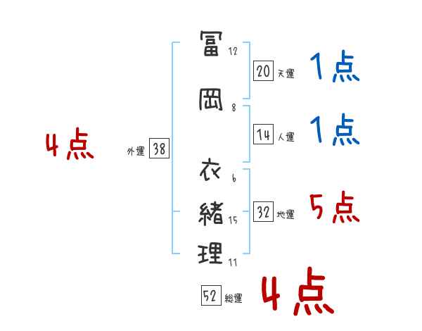 外運![]() | 冨岡衣緒理さんの外運は38画の4つ星!温厚な性格で技術的な才能を発揮する。職人的な仕事に向いている。 生活面を象徴する運勢です。外部から受ける影響力を表し、結婚運、家庭運や職場、環境への順応性を表します。 |