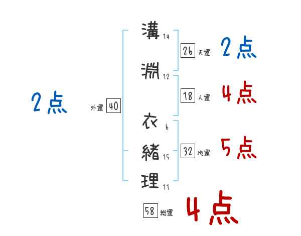 外運![]() | 溝淵衣緒理さんの外運は40画の2つ星!自信過剰で物事に固執するためトラブルに注意。 生活面を象徴する運勢です。外部から受ける影響力を表し、結婚運、家庭運や職場、環境への順応性を表します。 |