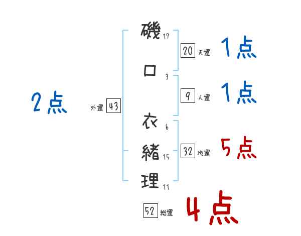 外運![]() | 磯口衣緒理さんの外運は43画の2つ星!頑固な性格で独立心が強いかも。やや非現実的で浪費に注意しましょう。 生活面を象徴する運勢です。外部から受ける影響力を表し、結婚運、家庭運や職場、環境への順応性を表します。 |