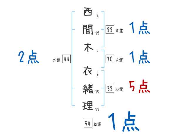 外運![]() | 西間木衣緒理さんの外運は44画の2つ星!誠実で慎重な性格。物事を考えすぎないように注意しましょう。 生活面を象徴する運勢です。外部から受ける影響力を表し、結婚運、家庭運や職場、環境への順応性を表します。 |