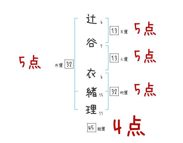 外運![]() | 辻谷衣緒理さんの外運は32画の5つ星!柔軟性があり成功する。チャンスが多く金運が良い。 生活面を象徴する運勢です。外部から受ける影響力を表し、結婚運、家庭運や職場、環境への順応性を表します。 |