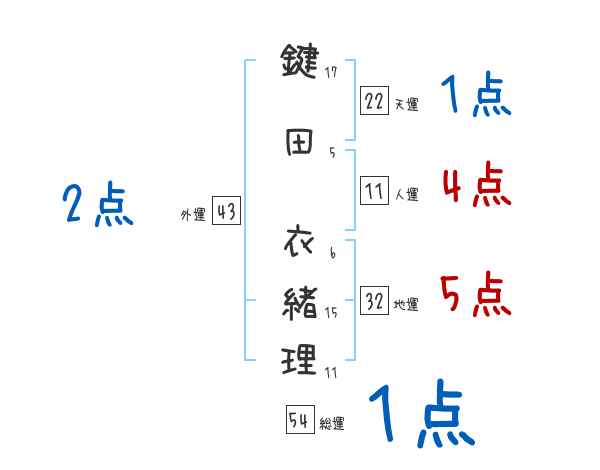 天運![]() | 鍵田衣緒理さんの天運は22画の1つ星!努力することが苦手ないっぽう手先が器用。芸術性にも優れる。 家系が持つ宿命的な運勢を表します。祖先から受け継いだ苗字ですので自分の力が及びません。家柄を象徴します。 |