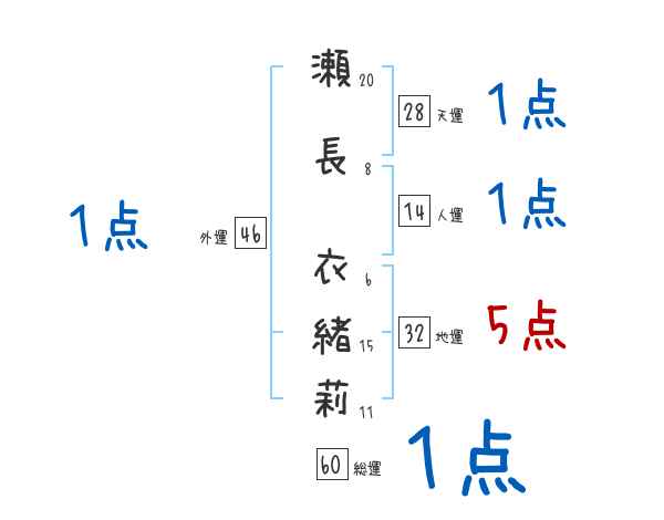 天運![]() | 瀬長衣緒莉さんの天運は28画の1つ星!家庭環境に注意。スポーツで活躍できる能力があるかも。 家系が持つ宿命的な運勢を表します。祖先から受け継いだ苗字ですので自分の力が及びません。家柄を象徴します。 |