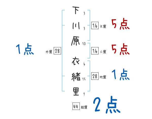 天運![]() | 下川原衣緒里さんの天運は16画の5つ星!人望が厚く大きく発展する。逆転成功が見える。 家系が持つ宿命的な運勢を表します。祖先から受け継いだ苗字ですので自分の力が及びません。家柄を象徴します。 |