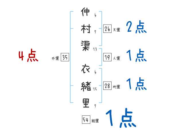 天運![]() | 仲村渠衣緒里さんの天運は26画の2つ星!波瀾万丈かも。信頼できる人を大事にしましょう。 家系が持つ宿命的な運勢を表します。祖先から受け継いだ苗字ですので自分の力が及びません。家柄を象徴します。 |