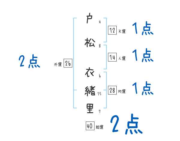 外運![]() | 戸松衣緒里さんの外運は26画の2つ星!波瀾万丈かも。信頼できる人を大事にしましょう。 生活面を象徴する運勢です。外部から受ける影響力を表し、結婚運、家庭運や職場、環境への順応性を表します。 |