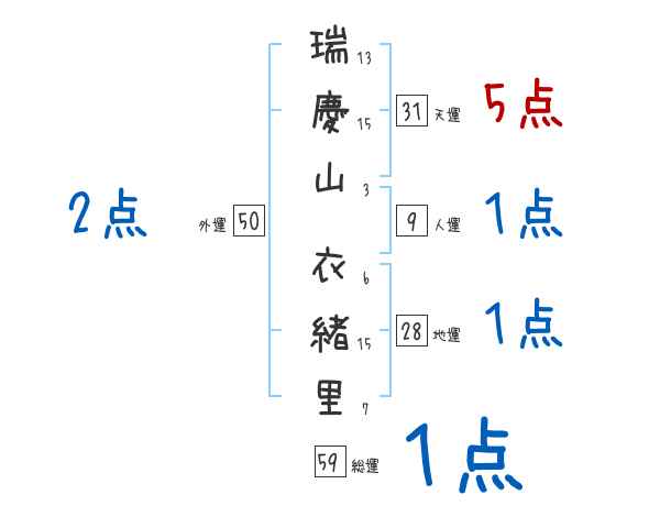 天運![]() | 瑞慶山衣緒里さんの天運は31画の5つ星!社交性があり判断力に優れる。順風満帆な人生で円満な生活。 家系が持つ宿命的な運勢を表します。祖先から受け継いだ苗字ですので自分の力が及びません。家柄を象徴します。 |