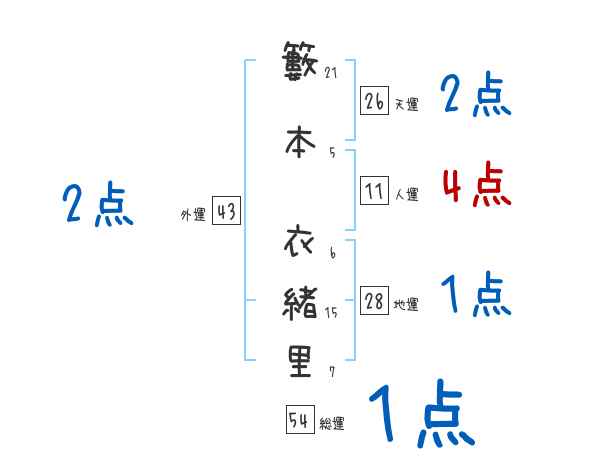 総運![]() | 籔本衣緒里さんの総運は54画の1つ星!トラブルが多いかも。周りをよく見て協調して過ごしましょう。 あなたの人生を表す1番重要な運勢です。生涯を通じて影響する総合運となり、主に50歳以降の晩年期に影響を及ぼします。 |