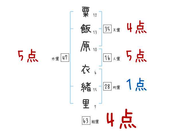 外運![]() | 粟飯原衣緒里さんの外運は47画の5つ星!実力が開花し発展する円満な人生。財に恵まれる。 生活面を象徴する運勢です。外部から受ける影響力を表し、結婚運、家庭運や職場、環境への順応性を表します。 |