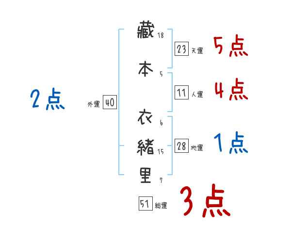 外運![]() | 藏本衣緒里さんの外運は40画の2つ星!自信過剰で物事に固執するためトラブルに注意。 生活面を象徴する運勢です。外部から受ける影響力を表し、結婚運、家庭運や職場、環境への順応性を表します。 |