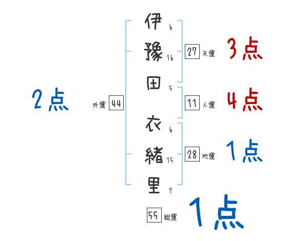 外運![]() | 伊豫田衣緒里さんの外運は44画の2つ星!誠実で慎重な性格。物事を考えすぎないように注意しましょう。 生活面を象徴する運勢です。外部から受ける影響力を表し、結婚運、家庭運や職場、環境への順応性を表します。 |