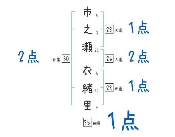 総運![]() | 市之瀬衣緒里さんの総運は56画の1つ星!消極的で無気力になりがち。誠実な気持ちが必要でしょう。 あなたの人生を表す1番重要な運勢です。生涯を通じて影響する総合運となり、主に50歳以降の晩年期に影響を及ぼします。 |