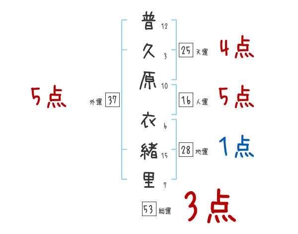 総運![]() | 普久原衣緒里さんの総運は53画の3つ星!やや見栄っ張りで虚栄心がある。散財に注意。 あなたの人生を表す1番重要な運勢です。生涯を通じて影響する総合運となり、主に50歳以降の晩年期に影響を及ぼします。 |