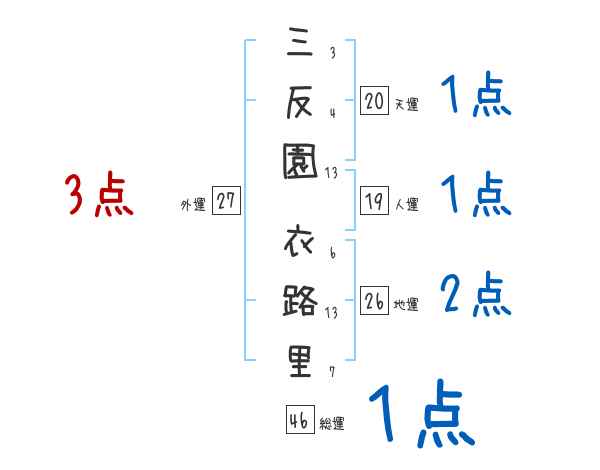 外運![]() | 三反園衣路里さんの外運は27画の3つ星!頭脳明晰だが強情で摩擦が多い傾向。孤立に注意。 生活面を象徴する運勢です。外部から受ける影響力を表し、結婚運、家庭運や職場、環境への順応性を表します。 |