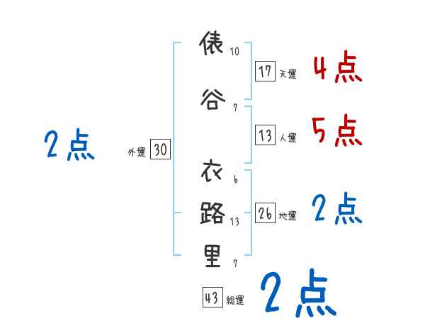 外運![]() | 俵谷衣路里さんの外運は30画の2つ星!浮き沈みの激しさに注意しましょう。 生活面を象徴する運勢です。外部から受ける影響力を表し、結婚運、家庭運や職場、環境への順応性を表します。 |