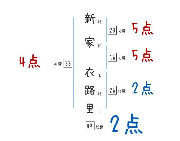 外運![]() | 新家衣路里さんの外運は33画の4つ星!権力志向でプライドが高い。勇気があり運を切り開き成功する。 生活面を象徴する運勢です。外部から受ける影響力を表し、結婚運、家庭運や職場、環境への順応性を表します。 |
