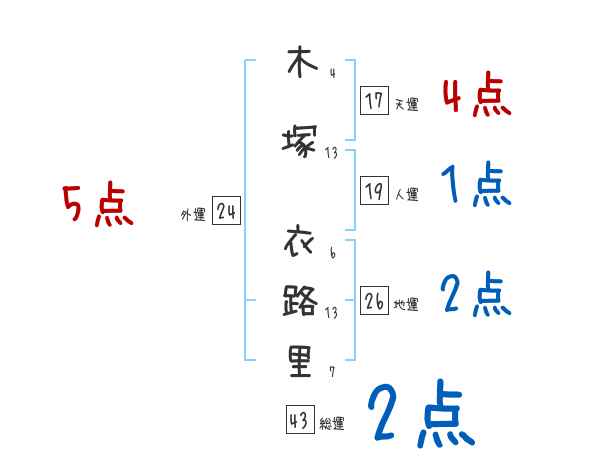 外運![]() | 木塚衣路里さんの外運は24画の5つ星!家庭運が良く順調な人生。金運にも恵まれる。 生活面を象徴する運勢です。外部から受ける影響力を表し、結婚運、家庭運や職場、環境への順応性を表します。 |