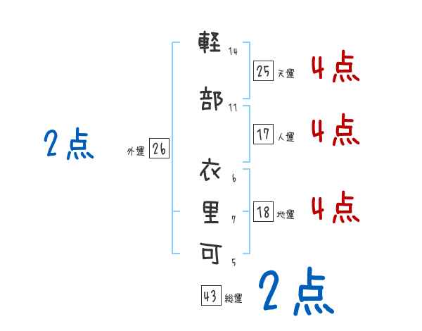 総運![]() | 軽部衣里可さんの総運は43画の2つ星!頑固な性格で独立心が強いかも。やや非現実的で浪費に注意しましょう。 あなたの人生を表す1番重要な運勢です。生涯を通じて影響する総合運となり、主に50歳以降の晩年期に影響を及ぼします。 |