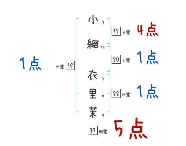 外運![]() | 小網衣里茉さんの外運は19画の1つ星!優れた才能を持ちますが、協調性が足りないことも。周りの人と協力する事を意識しましょう。 生活面を象徴する運勢です。外部から受ける影響力を表し、結婚運、家庭運や職場、環境への順応性を表します。 |