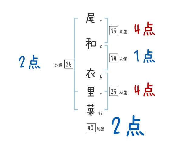 総運![]() | 尾和衣里菜さんの総運は40画の2つ星!自信過剰で物事に固執するためトラブルに注意。 あなたの人生を表す1番重要な運勢です。生涯を通じて影響する総合運となり、主に50歳以降の晩年期に影響を及ぼします。 |
