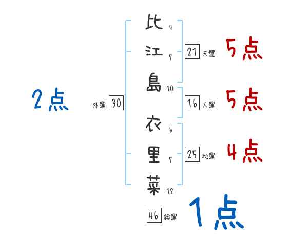 人運![]() | 比江島衣里菜さんの人運は16画の5つ星!人望が厚く大きく発展する。逆転成功が見える。 性格や才能などを表す2番目に重要な運勢です。人間関係や協調性、社会的な成功に影響します。主に20歳から50歳ぐらいまでの中年期の運勢を表します。 |