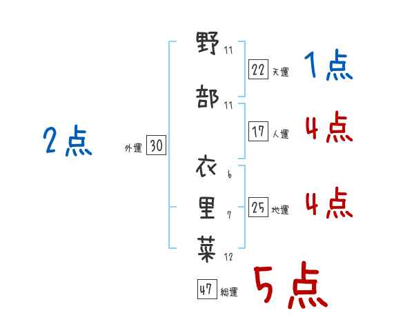 総運![]() | 野部衣里菜さんの総運は47画の5つ星!実力が開花し発展する円満な人生。財に恵まれる。 あなたの人生を表す1番重要な運勢です。生涯を通じて影響する総合運となり、主に50歳以降の晩年期に影響を及ぼします。 |