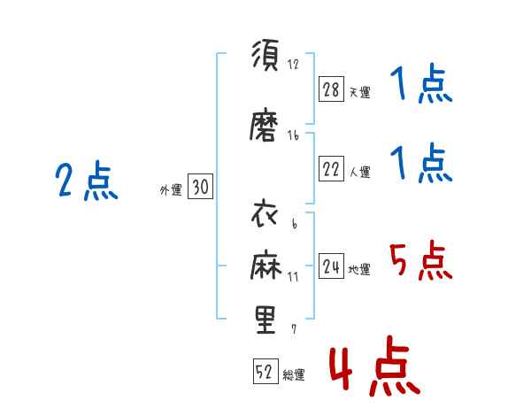 天運![]() | 須磨衣麻里さんの天運は28画の1つ星!家庭環境に注意。スポーツで活躍できる能力があるかも。 家系が持つ宿命的な運勢を表します。祖先から受け継いだ苗字ですので自分の力が及びません。家柄を象徴します。 |