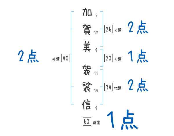天運![]() | 加賀美袈裟信さんの天運は26画の2つ星!波瀾万丈かも。信頼できる人を大事にしましょう。 家系が持つ宿命的な運勢を表します。祖先から受け継いだ苗字ですので自分の力が及びません。家柄を象徴します。 |