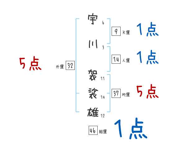 外運![]() | 宇川袈裟雄さんの外運は32画の5つ星!柔軟性があり成功する。チャンスが多く金運が良い。 生活面を象徴する運勢です。外部から受ける影響力を表し、結婚運、家庭運や職場、環境への順応性を表します。 |