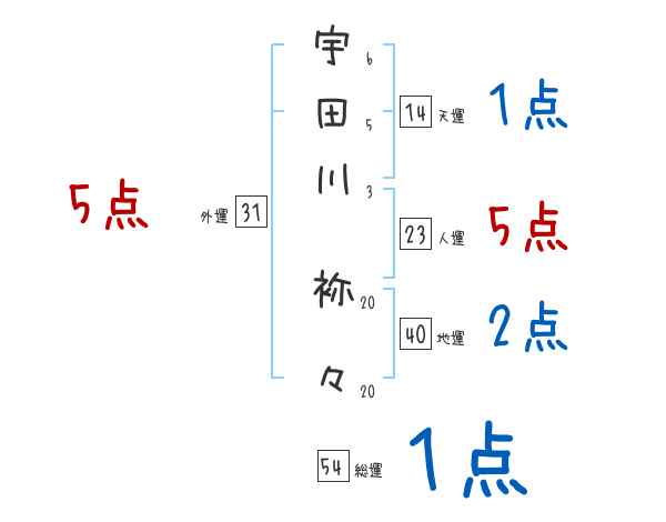 天運![]() | 宇田川袮々さんの天運は14画の1つ星!人に対して優しいがストレスを溜め込みがち。人間関係のトラブルを避けるよう気をつけましょう。 家系が持つ宿命的な運勢を表します。祖先から受け継いだ苗字ですので自分の力が及びません。家柄を象徴します。 |